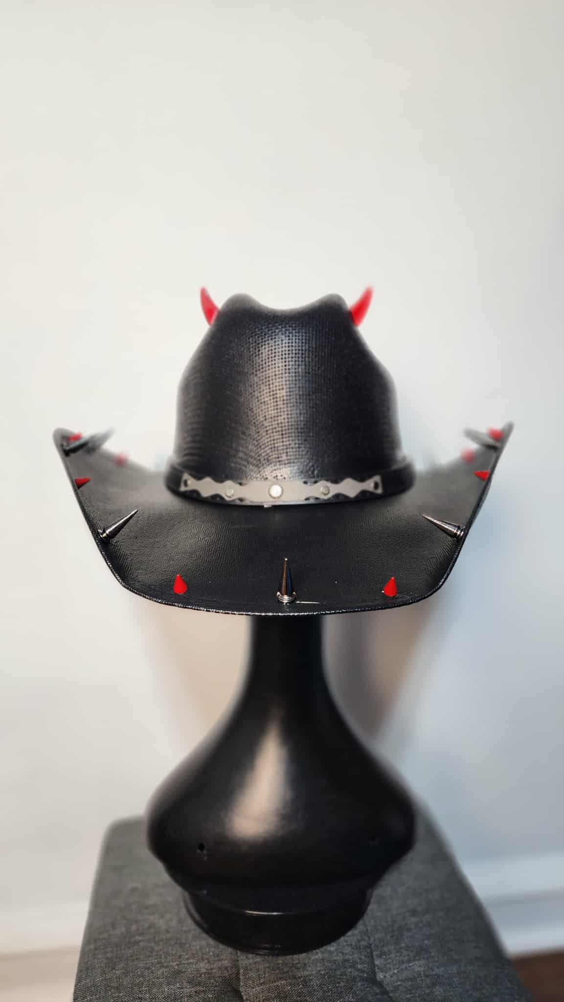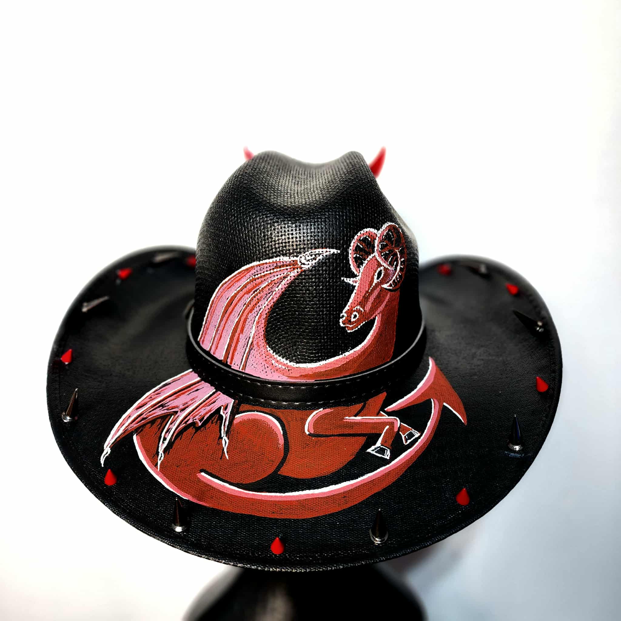 The hand-painted design is a wearable art creation that is sure to catch the eye of anyone who sees it that is familiar with the Pine Barrens. It features a hand painted red Jersey Devil on the back, with matching red spikes along the brim and little red horns on top.