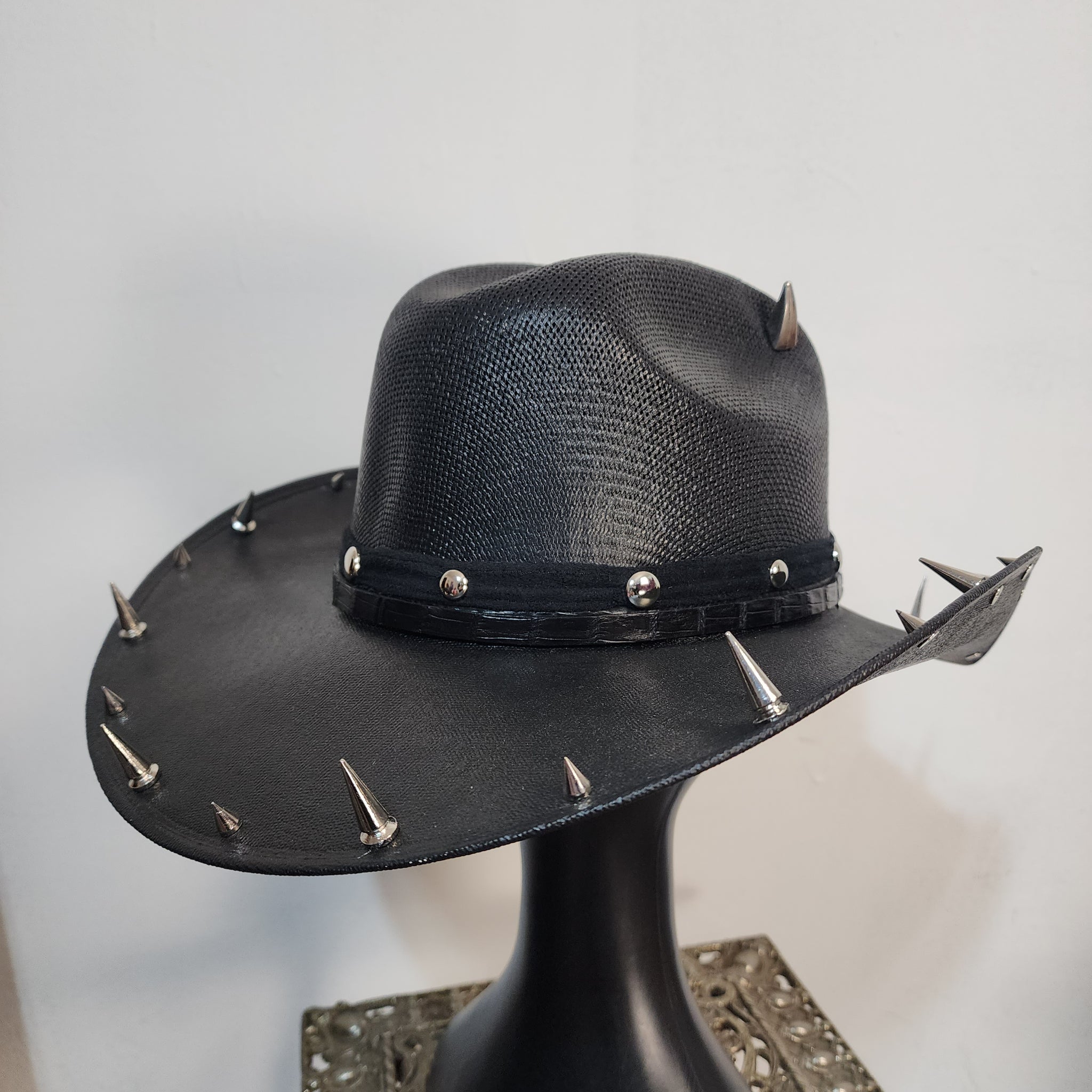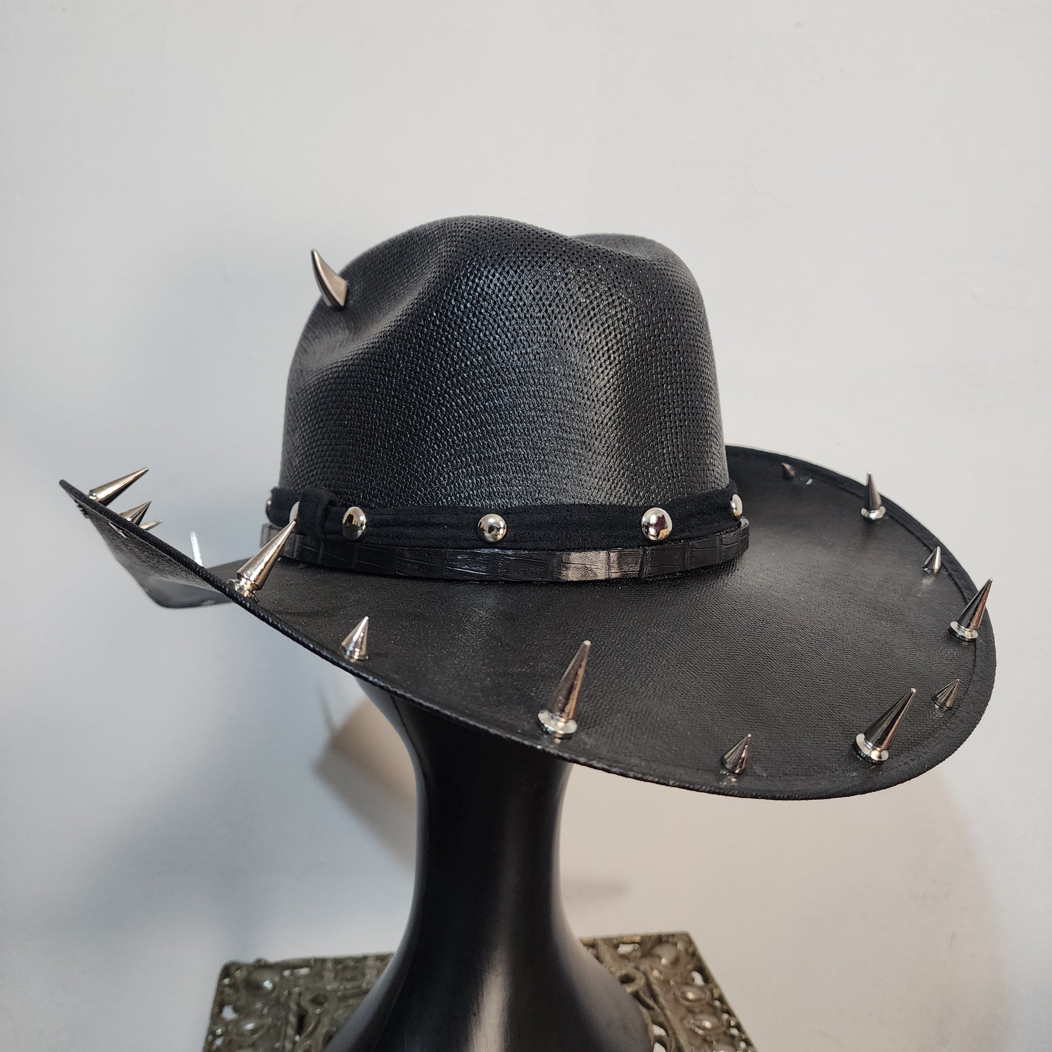 This hard canvas cowboy hat is black with a y'allternative goth punk style and features silver studs, horns, and a bronze skull on the front. The bottom band is 100% authentic alligator leather with a bronze buckle and the the band on top is vegan suede with silver studs.